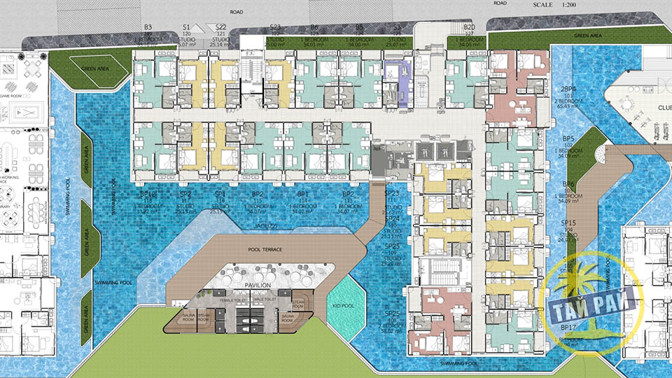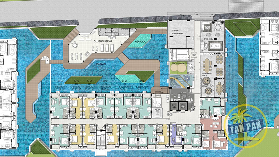- Здание С: Клубный дом с фитнес центром, ресепшен, игровая комната, стимутор для игры в гольф, детская игровая комната, коворкинг, библиотека, комната для переговоров, бассейн с джакузи, детский бассейн.