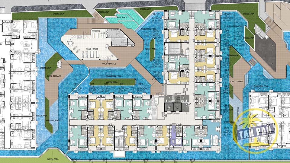 - Здание F: Павильон для отдыха, бассейн с джакузи, детский бассейн.