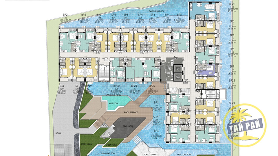 - Здание А: Лобби, магазин, бассейн, детский бассейн.
