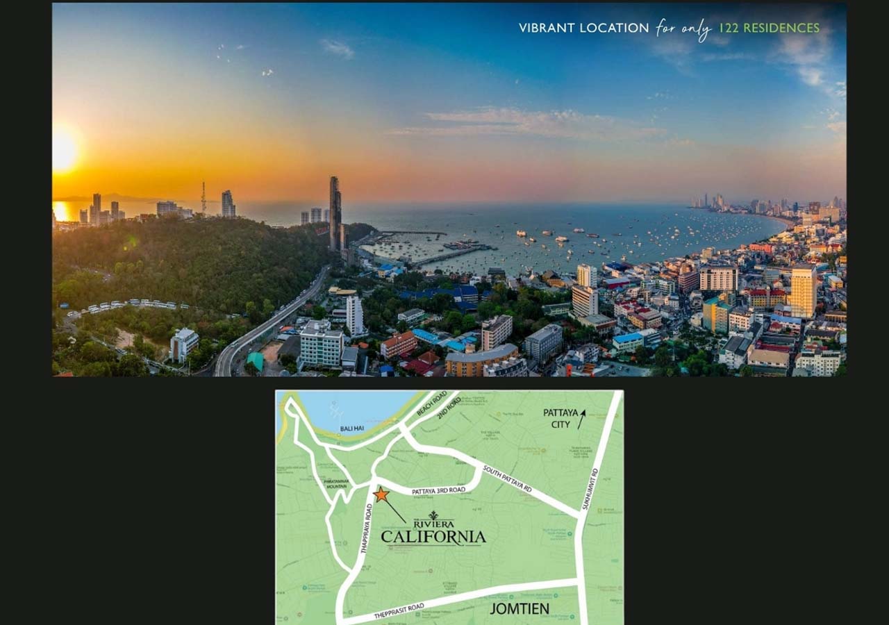 Новостройка RIVIERA CALIFORNIA (Ривьера Калифорния) расположена на улице Таппрайя-роуд в Паттайе, в нескольких минутах от всемирно известной пешеходной улицы и в нескольких минутах от Джомтьена, в самом центре города Паттайя.